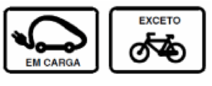 Os painéis adicionais, como habitualmente, servem como complemento à sinalização vertical. Ou seja, não são usados isoladamente, mas sempre em conjunto com outro sinal. Aqui, por exemplo, foi adicionado um novo painel que indica que uma determinada mensagem só se aplica aos veículos elétricos em carga, ou outro que exclui os velocípedes das prescrições apontadas na sinalização vertical.