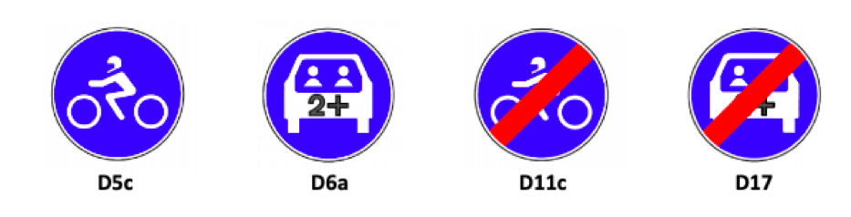 > D6a - Via reservada a veículos com alta taxa de ocupação: indicação de via de trânsito reservada apenas à circulação de veículos que transportem duas ou mais pessoas incluindo o condutor;