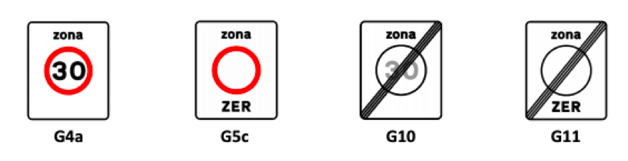 > G4a - Zona 30hm/h: indicação de entrada numa zona 30km/h em que são aplicados dispositivos de acalmia de tráfego de modo a limitar a velocidade máxima de circulação a 30 km/h;